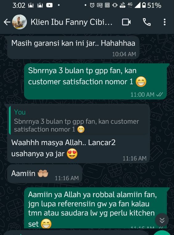 Namanya barang dipakai tentu suatu saat kemungkinan ada yang perlu diservis atau diperbaiki. Triasteri selalu siap untuk melayani para pelanggan kami, agar kitchen set mereka bisa selalu tampak baru dan terawat. Bahkan untuk selama 3 Bulan masa garansi konsumen tidak perlu mengeluarkan biaya sama sekali, entah itu biaya material ataupun jasa tukang. Sedangkan struktur kekuatan kabinet atas itu bergaransi hingga 5 tahun.
